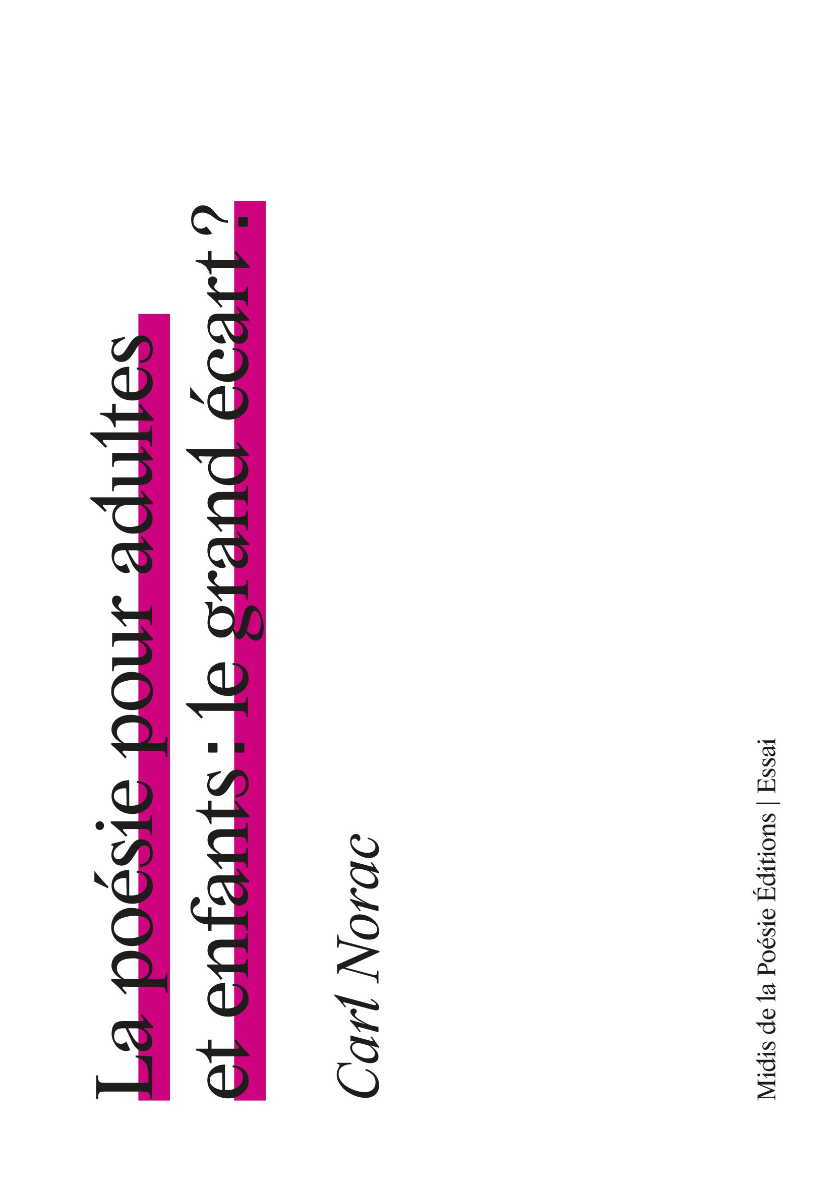 «Les enfants d'aujourd'hui sont les derniers à pouvoir inverser le chaos à venir», écrit Carl Norac. Je plus que plussoie. Aux enfants nous devons le meilleur, et ce, dans tous les domaines. Carl parle ici de poésie : pour enfants ou pour adultes ? Il serait bon d'abolir les frontières, de passer outre les a priori. Vive la candeur, laquelle n'est pas naïveté. Vive la poésie qui toujours sort des cadres et autres espaces clos, et n'appartient à personne, donc à tout le monde. Vive le partage, à l'école ou dans la rue, chez soi ou dans la lune ou les deux, des mots qui nous grandissent. Nous avons plus que jamais besoin d'air.